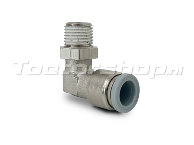 So you can screw this right-angled coupling into a 1/4 BSP input and connect an 10 millimeter tube to it.