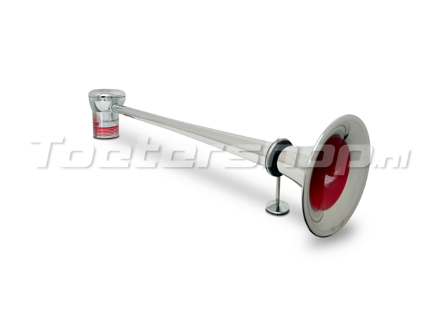 Our Italian giant. A 65 cm air horn with a horizontal diaphragm, protected against the elements. Chrome-plated with a classic red bell. Developed and made in Italy.