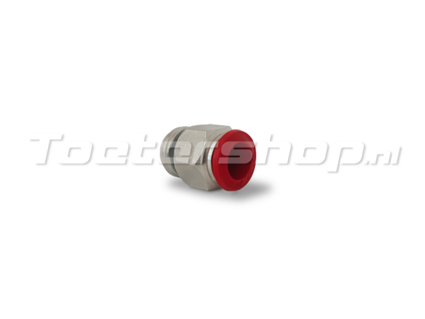 Straight push-in fitting for 8mm air tube. With PTC connection for 8mm tube and 1/4" male thread. The male thread is short and tapered, making it compatible with both NPT and BSP fittings.